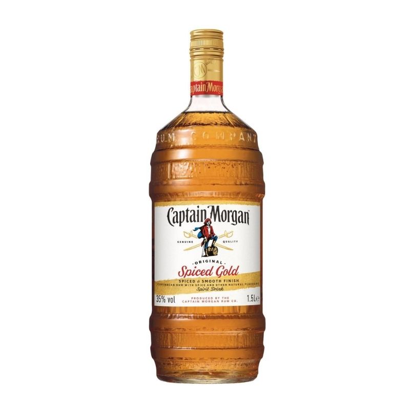 Captain Morgan Spiced Gold 1.5L is a 1.5-liter bottle of spiced rum, a blend of the finest Caribbean rums with natural flavors and warming spices like vanilla, brown sugar, dried fruit, cinnamon, and clove. It is matured in charred American oak bourbon barrels, which contribute to its rich color, aroma, and complex, smooth taste. This spirit is versatile, enjoyed neat, on the rocks, mixed with cola, ginger ale, or used in cocktails and cooking.Â